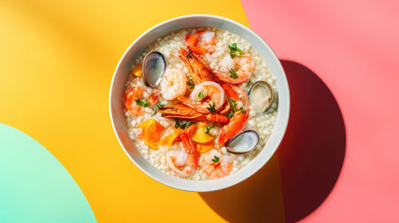 A delicious bowl of creamy seafood risotto featuring fresh shrimp and clams, beautifully presented on a vibrant orange and yellow background. Ideal for food lovers.
