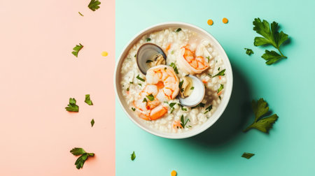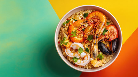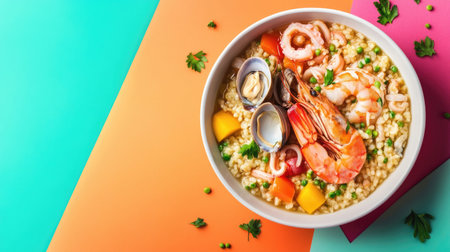 A vibrant bowl of seafood risotto featuring shrimp, clams, and fresh vegetables on a colorful background, perfect for culinary enthusiasts and food lovers.