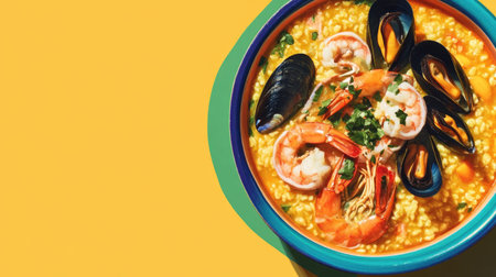 A colorful bowl of seafood paella featuring shrimp, mussels, and fresh herbs against a bright yellow background, perfect for showcasing delicious cuisine.