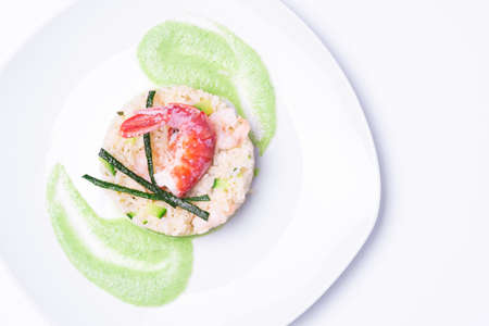 risotto with shrimp and zucchini cooked by chef on white background with very bright light and horizontal shot