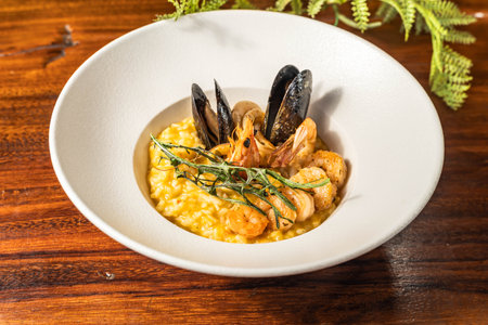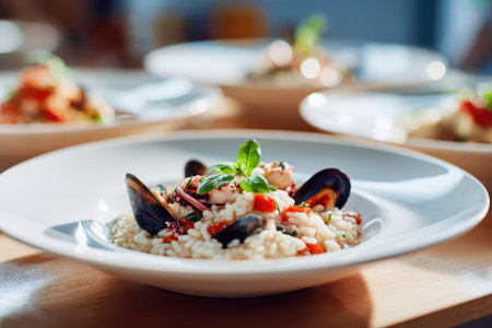 Delicious seafood risotto featuring mussels served in an elegant dining setting during a sunny afternoon