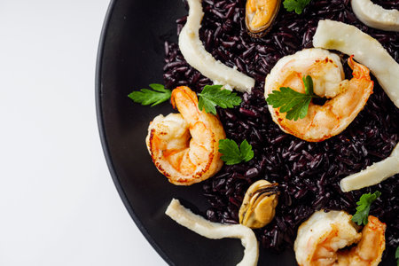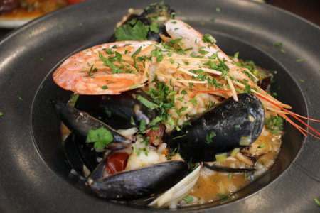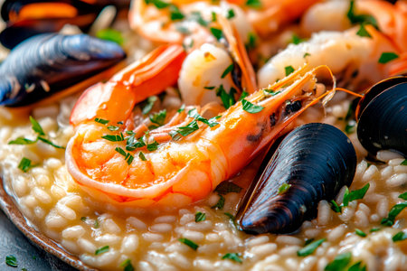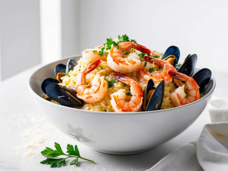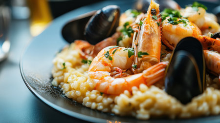 A mouthwatering plate of seafood risotto featuring succulent shrimp and mussels, garnished with fresh parsley. Perfect for seafood lovers and food enthusiasts.