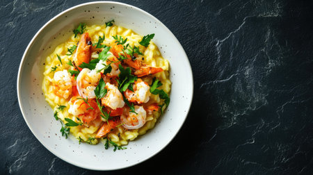 A captivating top-down view of saffron infused shrimp risotto garnished with fresh herbs, showcasing vibrant colors and appetizing textures for gourmet dining.
