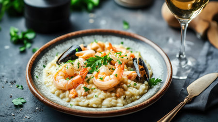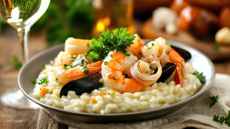 A beautifully plated seafood risotto with shrimp, mussels, and squid, garnished with parsley and served with a glass of white wine.