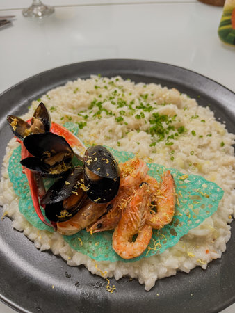 AI Generated. Delicious seafood risotto garnished with mussels and shrimp