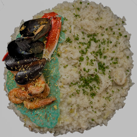 Experience the essence of modern cuisine with this vibrant risotto featuring fresh vegetables and clams, elegantly plated for fine dining enjoyment.
