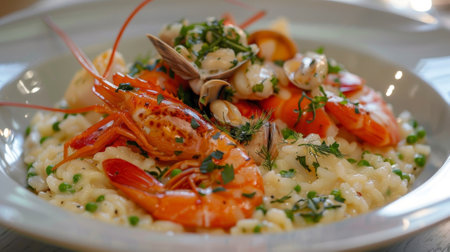 A stunning seafood risotto featuring shrimp and mussels, garnished with fresh herbs. Perfect for food lovers and culinary enthusiasts looking for vibrant presentation.