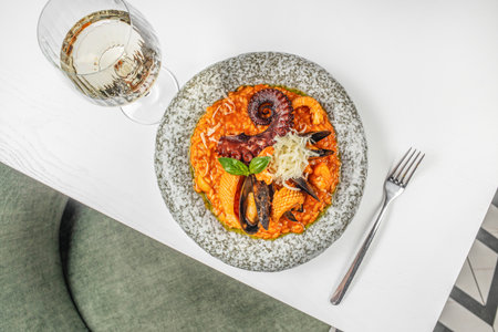 Flat lay of a gourmet seafood risotto with octopus tentacle, mussels, squid, tomato sauce, and grated parmesan cheese, served on a stone plate with a glass of white wine. Mediterranean food.