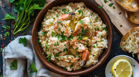 Top view of a crab risotto with a lemon butter sauce, garnished with fresh herbs and served with a side of garlic bread.