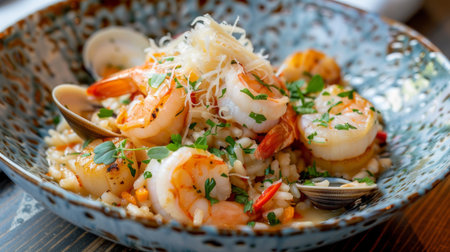 A seafood risotto with shrimp, scallops, and clams, topped with Parmesan cheese and fresh herbs