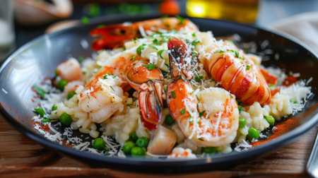 A seafood risotto with lobster meat, shrimp, scallops, and peas, garnished with parmesan cheese.