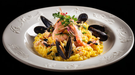 This exquisite dish features saffron-infused risotto topped with succulent seafood and fresh herbs, showcasing vibrant colors and rich flavors. Perfect for gourmet dining.