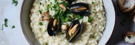 Savor the rich flavors of traditional risotto topped with fresh mussels and parsley, showcasing a warm and inviting meal perfect for any Italian dining experience, banner