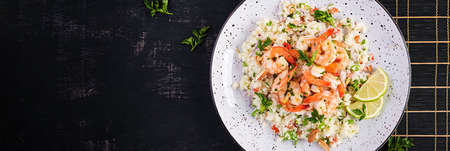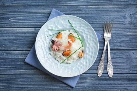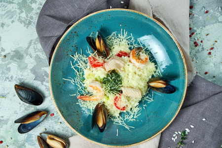 Italian risotto with shrimps, mussels, octopus, clams. Mediterranean cuisine. Restaurant menu, dieting cookbook recipe top view.