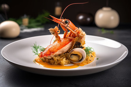 a dish of sea seafood on a plate in a restaurant. sea delicacies, generative ai,