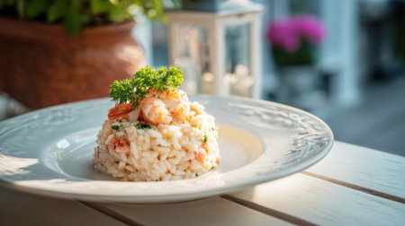 Elegant seafood risotto with shrimp and fresh parsley garnish served on white porcelain plate. Gourmet Italian rice dish presented in upscale restaurant setting with natural lighting.