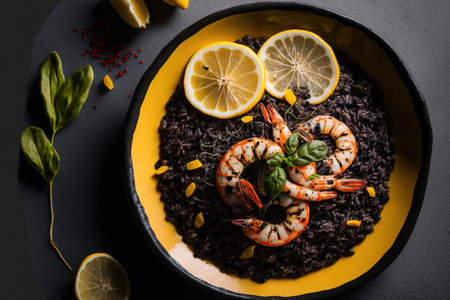 Top view of a mouthwatering black risotto with shrimp and lemon on a gray table. photography of food