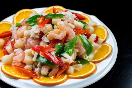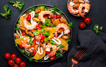 Delicious seafood salad with shrimp, mussels, squid, oranges, lettuce and olive oil with lemon dressing, black background, top view