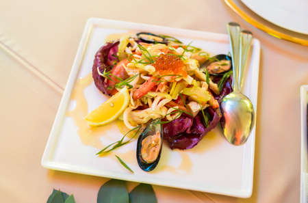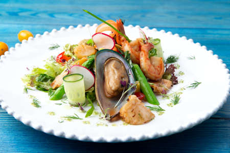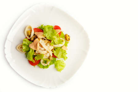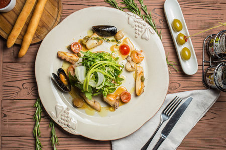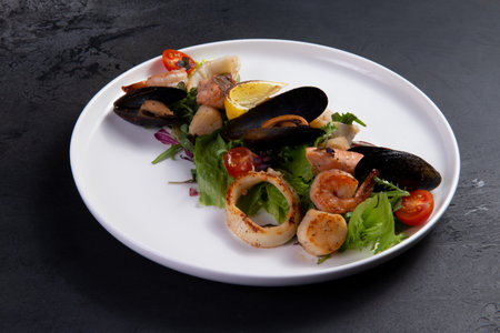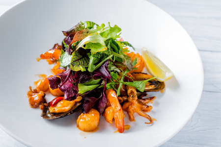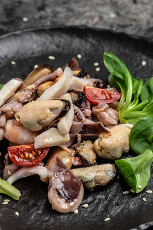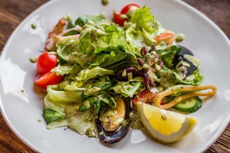 Restaurant dish with seafood close-up. Sea salad with mussels, shrimps and squid rings with vegetables.