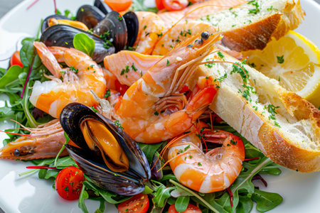 Seafood with Garlic Baguette, Toasted Bread, Cooked Prawns, Shrimps, Mussels and Salmon Fillet with Greens Closeup, Generative AI Illustration