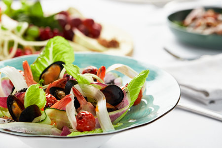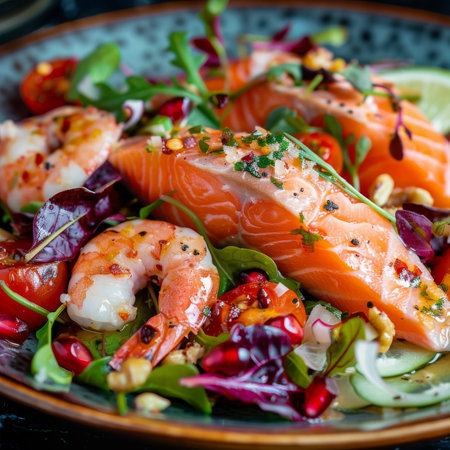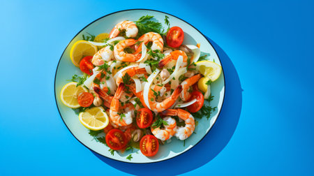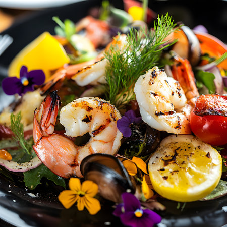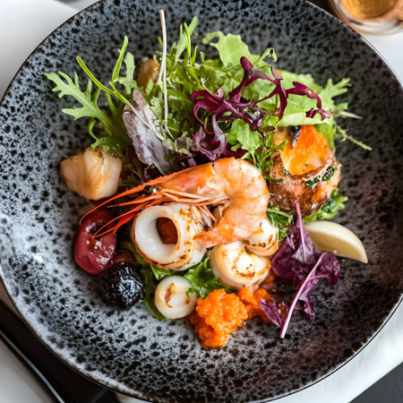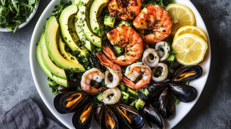 A vibrant seafood salad featuring shrimp, mussels, and fresh greens, garnished with lemon. Ideal for gourmet dining or healthy meal options.