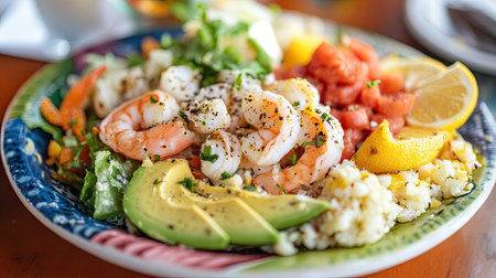 A colorful plate featuring fresh shrimp salad garnished with avocado slices, lemon wedges, and mixed vegetables, perfect for a healthy meal option.