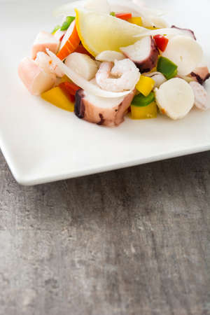 Tasty fish salad with shrimps baby octopus herbs oyster lemon and sauce.