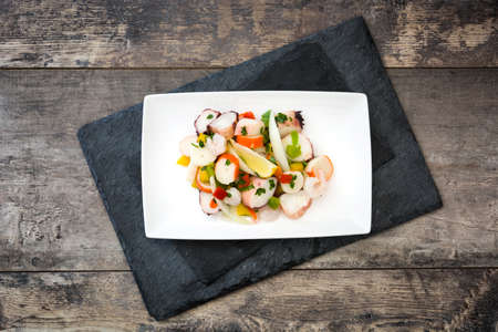 Seafood salad with shrimp, squid and mussel. Top view, flat lay, overview