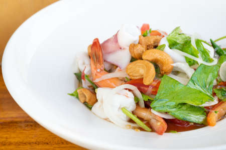 Vermicelli spicy salad with seafood and cashew in white dish on wooden table.