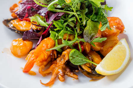 Tasty fish salad with shrimps baby octopus herbs oyster lemon lettuce and sauce. Close up image.