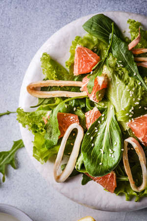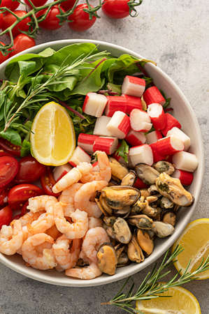Fresh sea food salad with green mix, cherry tomatoes, herbs and olive oil, lemon dressing. Healthy foods