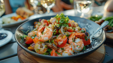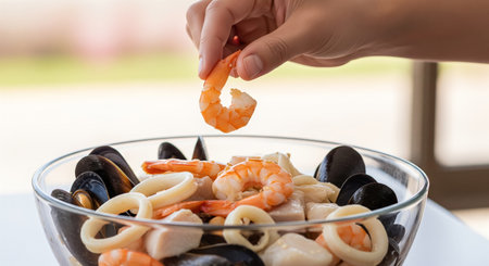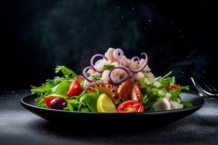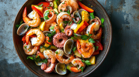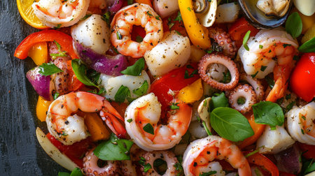 A vibrant seafood medley featuring shrimp, octopus, and fresh vegetables. Perfect for healthy meals or gourmet cooking, this dish showcases colorful ingredients.