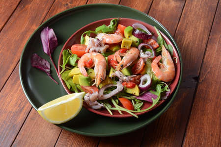 Sea food salad with shrimps, avocado, cherry tomatoes, red hot chilly pepper, red onion, arugula, beet leaves,rukola.balsamic sauce in a plate on a wood background Healthy sea food concept.