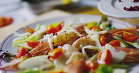 Fresh mediterranean seafood salad with olive oil, lemon, tomatoes and lettuce in red plate and few drops of lemon juice from the hand of an unidentified woman on the table in restaurant