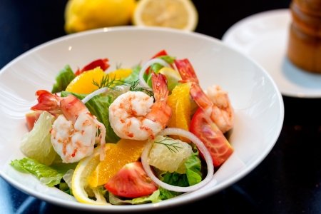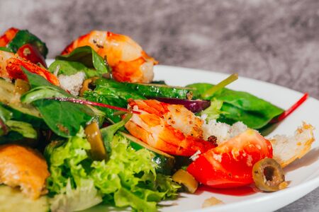 Dietary dish of shrimp and salad, great for fitness and proper nutrition, light and tasty