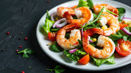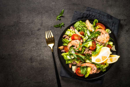 Shrimp salad on black background. Healthy seafood with prawns on white plate.