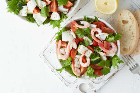 Seafood salad with squid, shrimp, cucumbers, tomatoes and lettuce. LCHF, FODMAP