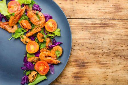 Appetizing bright salad with shrimps, tomato and lettuce on a plate.