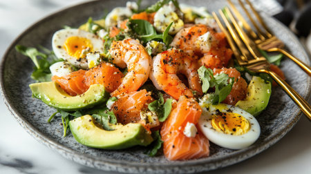 Luxury seafood salad with prawns, salted salmon, avocado, and eggs, plated on a marble surface with elegant gold cutlery.