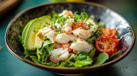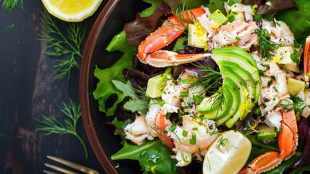 A vibrant seafood salad featuring mixed greens, fresh crab meat, avocado slices, and a light vinaigrette, showcasing the variety of seafood ingredients.