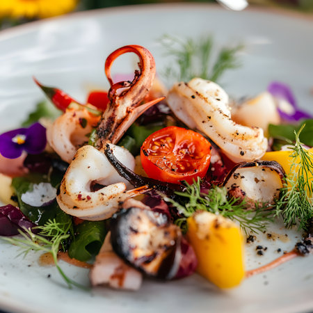 Seafood salad with squidpus, mussel and cherry tomatoes. grilled food, edible flowers, selective focus.