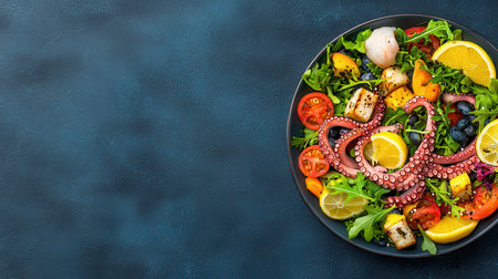 A vibrant seafood salad featuring fresh octopus, leafy greens, citrus slices, and an assortment of berries, perfect for a healthy meal.