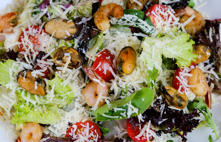 mussels Shrimp salad cheese Salad with cheese and tomato cherry