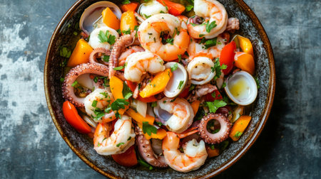 A colorful seafood salad photographed from above, with a mix of shrimp, octopus, and clams tossed in olive oil, fresh vegetables, and herbs.