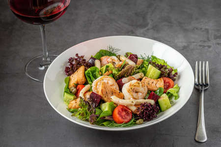 Healthy food concept, Diet salad plate. Fresh seafood salad recipe. Grilled shrimp prawns, fresh vegetable salad and egg.