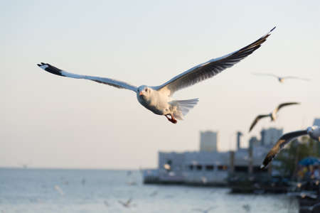 Seagulls are about to fly, background, flocks of seagulls flying.at Bangpoo, Thailand.
