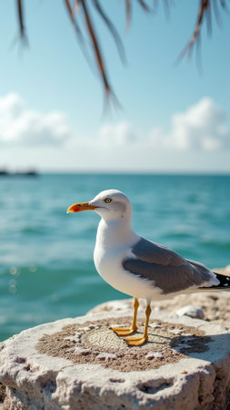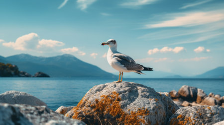 Seagull perched on rock by ocean on sunny day with clear sky. That the image is generated using AI.