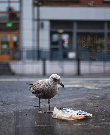 Seagulls on the street rummaging through a garbage bag looking for food