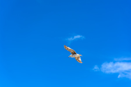 Single seagull flying in a blue sky background