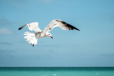 Seagull in flight with magnificent wingspan against turquoise ocean backdrop.